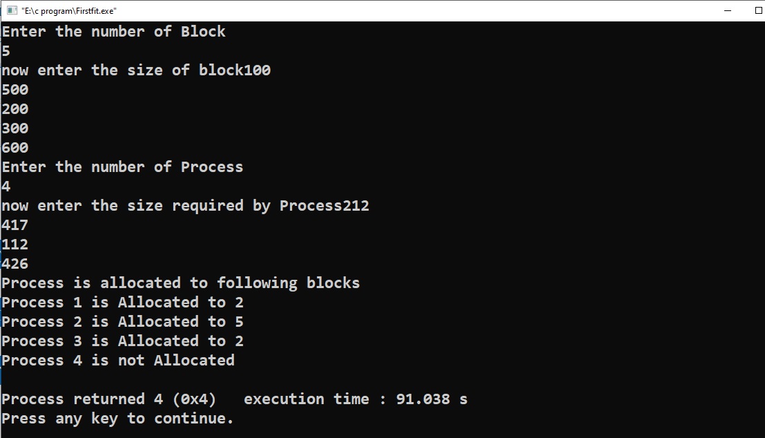 it is the function we are going to use First_fitCAT(int Blocksize[ ],int SizeofProcess[ ],AllocationStatus[ ])