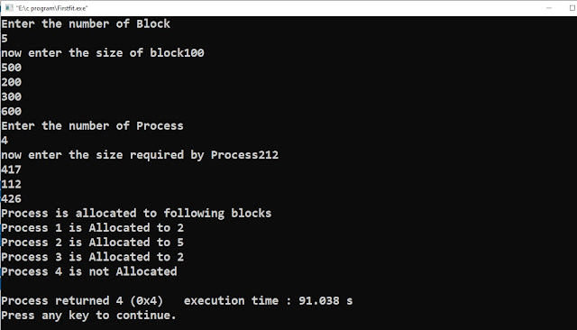 In order to implement First fit contiguous allocation techniques there is certain requirement first we need Block size, Number of Block that is m, Number of Process is n, Size of each and every process